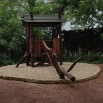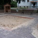 Im ruhigen Hinterhof gelegener Spielplatz mit großem (und anspruchsvollem) Klettergerüst und Rutsche für größere Kinder, Karussel, Wippe und Schaukeltier sowie Buddelkasten und Spielhäuschen für die Kleinsten. Eine Spielzeugkiste gibt es auch, die jedoch meist nur wenig Spielzeug enthält.