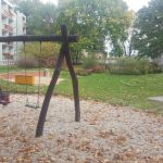Ein typischer Hinterhofspielplatz: Schaukel, Sandkasten, Wiese. Positiv hervorzuheben ist die Kleinkindschaukel.