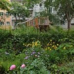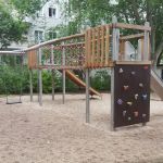 Ruhig und grün im Innenhof gelegen, präsentiert sich dieser Spielplatz mit vielen Spielgeräten: Rutsche, großes Klettergerüst mit Hängebrücke und Kletterwand, Schaukel, Sandkasten, Maltafel. Schön sind auch die Sitzecken und Bepflanzungen, die vor allem in heißen Sommertagen für Abkühlung bringen.